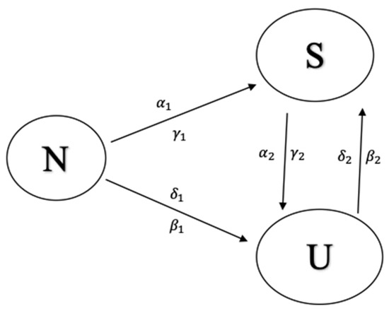 The transmission before and after online education is considered. The compartments are , , and , which denote the initial situation, successful education, and unsuccessful education, respectively. The system is defined by a system of linear ordinary differential equations:
