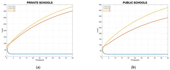 Table 4 presents the predicted success (S) and unsuccessful (U) levels based on the model, both with the original parameter values and with a 10% increase in the specific parameter γ2. In (a) and (b), respectively, the effect of the modification of on the number of private and public schools is displayed. “Level” on the vertical axis represents a dimensionless indicator of relative success in mathematics education based on model outputs. Time is measured in years.