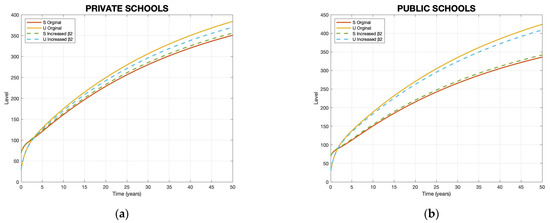 Table 4 presents the predicted success (S) and unsuccessful (U) levels based on the model, both with the original parameter values and with a 10% increase in the specific parameter β2. In (a) and (b), respectively, the effect of the modification of on the number of private and public schools is displayed. “Level” on the vertical axis represents a dimensionless indicator of relative success in mathematics education based on model outputs. Time is measured in years.