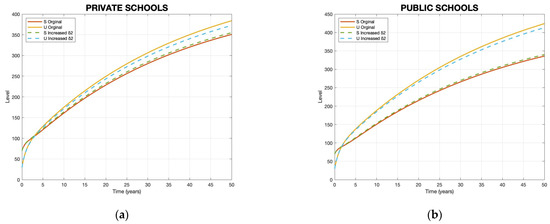 Predicted success (S) and unsuccessful (U) levels by the model with the original parameter values in Table 4 and with a 10% increase in the specific parameter . In (a) and (b), respectively, the effect of the modification of on the number of private and public schools is displayed. “Level” on the vertical axis represents a dimensionless indicator of relative success in mathematics education based on model outputs. Time is measured in years.