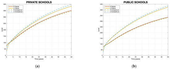 Success (S) and unsuccessful (U) levels predicted by the model with the original parameter values in Table 4 and with a 10% increase in the specific parameter . In (a) and (b), respectively, the effect of the modification of on the number of private and public schools is displayed. “Level” on the vertical axis represents a dimensionless indicator of relative success in mathematics education based on model outputs. Time is measured in years.