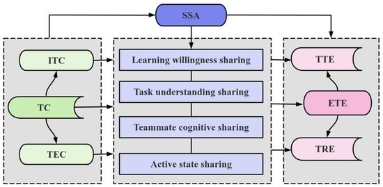 SMMs represent the collective psychological framework and cognitive structure among team members. They reveal the shared nature of implicit cognition and provide deep insights into enhancing team effectiveness [33,34]. SMMs encompass task-related and team-related content: the former includes learning willingness sharing (LWS) and task understanding sharing (TUS), while the latter involves teammate cognitive sharing (TCS) and active state sharing (ASS). These constructs collectively drive team performance and innovation outcomes [35]. Research indicates that team communication is critical for forming SMMs. Effective communication fosters information sharing and cognitive consistency among team members, thereby enhancing collaboration efficiency and capability [29,30].
