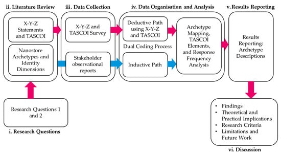 The research design considered a methodology consisting of five stages (see Figure 2): (i) RQs formulation, (ii) literature review, (iii) data collection, (iv) data organisation and analysis, (v) results reporting, and (vi) discussion. Section 1 presents the RQs, while Section 2 introduces the literature review on nanostore identity. The following subsections outline the data collection methods, data organisation, and analysis procedure, as well as the rationale for interpreting and reporting the results.