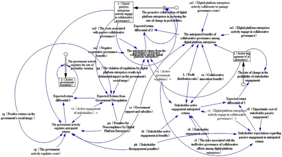 The model encompasses various variable components, where the level variables include the probabilities of government, digital platform enterprises, and stakeholders opting for collaborative governance, denoted as , , and , respectively. The rate variables reflect the rate of change in the probabilities of the three governance entities selecting collaborative governance strategies, represented as , and . The mediating variables consist of the expected returns from different decision-making strategies chosen by the three governance entities, along with the differences in these expected returns. The exogenous auxiliary variables include , , , , , , , , , , , , , , and .