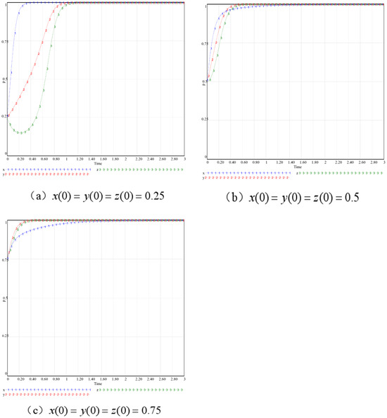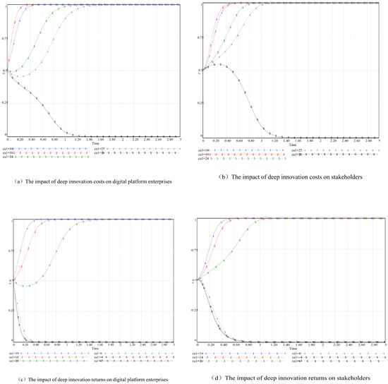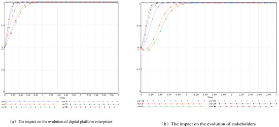 To conduct an in-depth analysis of the variations in costs and benefits associated with core digital platform enterprises during the active collaborative governance process and their impact on the evolutionary game of governance entities, this study sets the cost of active collaborative governance, , at 10, 16 (initial state), 24, 25, and 26. The simulation results are illustrated in Figure 8a,b. When is relatively low, the government, digital platform enterprises, and stakeholders gradually stabilize at a state of active regulation, active collaborative governance, and active participation. Conversely, when is significantly high, digital platform enterprises must weigh the trade-offs between benefits and costs, resulting in a prolonged period to reach equilibrium. During this phase, stakeholders may lean towards adopting a strategy of passive participation due to the uncertainties surrounding the governance strategies of digital platform enterprises.