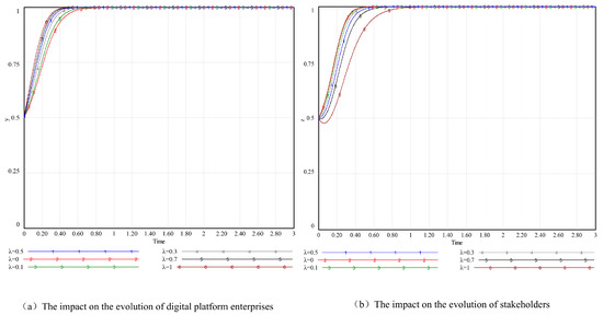 With other parameters unchanged, this paper makes the gains be −5, −4, 0, 10, 14, and 19 (the initial state) and compares the evolution paths of governance strategies of digital platform enterprises and stakeholders, and the results are shown in Figure 8c,d. Comparing the initial state, it can be seen that the size of the benefits of digital platform enterprises actively cooperating in governance affects the stability of the game system of the three-party governance subjects. If the digital platform enterprise in cooperative governance achieves higher gains at the same moment it adopts the active regulation strategy, then the digital platform enterprise should adopt the active cooperative governance strategy and stakeholders should adopt the active participation strategy. If the digital platform enterprise in the cooperative governance has lower revenue or even losses, the digital platform enterprise will consider the costs and benefits of active cooperative governance and will tend to choose the strategy of negative cooperative governance, and at this time, the cross-domain digital innovation ecosystem collaborative governance tends to deteriorate and the stakeholders will take into account the losses brought about by the negative cooperative governance of the digital platform enterprise, , and will also choose the governance strategy of negative participation. It can be seen that the high cost consumed by the digital platform enterprise’s positive cooperative governance will lead it to choose the negative cooperative governance; however, the digital platform enterprise, as the key core subject of collaborative governance, will lead to a change in the stakeholders’ governance strategy by its choice of governance strategy. Therefore, in the process of the collaborative governance of cross-domain digital innovation ecosystems, we should play a supervisory role as far as possible, appropriately give certain incentives and subsidies to the core body of digital platform enterprises, and at the same time, actively mobilize stakeholders to participate in the governance initiative.