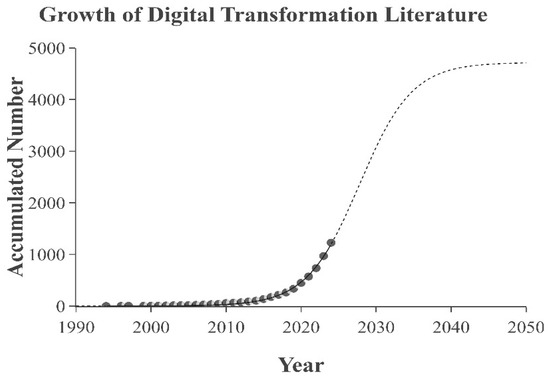 The volume of scholarly publications in the field of DT has steadily increased over time, as depicted in Figure 2. This upward trend reflects a sustained and growing interest in the topic. The findings of this study are consistent with prior research suggesting that DT has gained substantial prominence over the past decade. Scholars increasingly acknowledge DT as an ongoing and evolving process that continues to influence and reshape individual behavior, organizational practices, and broader societal structures [35,36]. Based on the observed trajectory, it is reasonable to anticipate that research activity in this domain will continue to grow, with significant expansion likely to persist through 2030 if current trends hold.