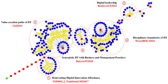 The top three citation links with the highest traversal densities along the main path are attributed to Yoo [40], Wheeler [38], and Yoo, Henfridsson, and Lyytinen [39]. Among these, Yoo [40] exhibits the highest knowledge flow link density, signifying this study’s centrality and frequent citation within the DT literature. This study introduces a schematic framework for experiential computing, highlighting how digital technologies reshape everyday human experiences and interactions. Wheeler [38] contributes the Net-Enabled Business Innovation Cycle (NEBIC) model, which offers a strategic perspective on how organizations can leverage digital networks to enhance their capacity for customer value creation. Yoo, Henfridsson, and Lyytinen [39] further advance the theoretical landscape by proposing a comprehensive conceptual framework that articulates the emerging organizing logic of digital innovation. Their work outlines a research agenda for digital strategy and addresses the development and governance of enterprise-level information technology infrastructures.