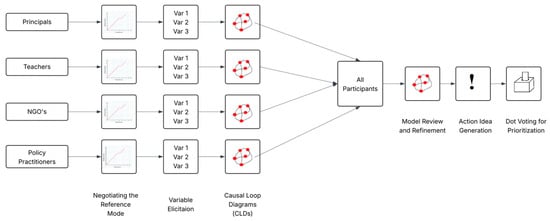 20]. These scripts were designed to progressively guide participants through system conceptualization, causal structure development, and intervention design. The overall flow of the CBSD workshop—from stakeholder engagement to model building and prioritization—is summarized in