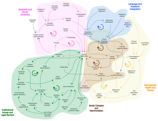 The CBSD process and the causal loop diagram collectively revealed a complex, tightly interconnected system shaping refugee students’ educational participation. Although the themes were analyzed individually, the system exhibited significant cross-theme interactions, creating feedback-rich dynamics that complicated straightforward interventions.