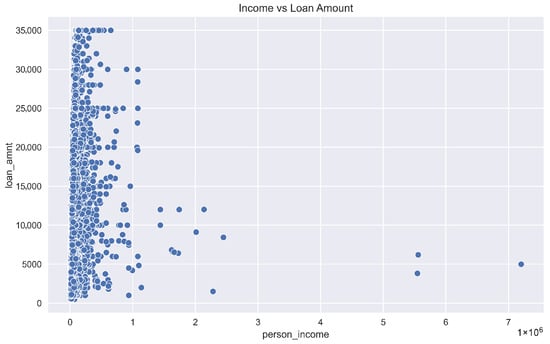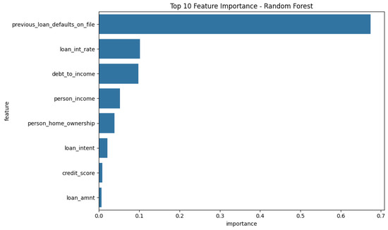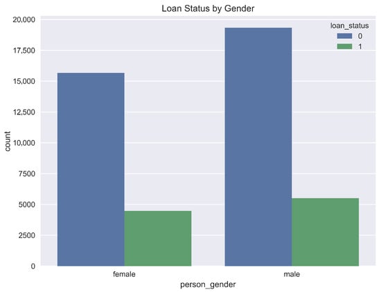 An exploratory data analysis was conducted to understand the characteristics of the dataset and inform the modeling process. The visualizations in Figure 1, Figure 2, Figure 3, Figure 4, Figure 5, Figure 6 and Figure 7 provide insights into key variables. The age distribution (Figure 1), while not perfectly normal, is handled effectively by the non-parametric tree-based models used in this study, which do not require normally distributed data. The purpose of this plot is to offer a descriptive overview of the age variable, whose predictive power is formally assessed in the feature importance analysis (Section 4.4). Figure 2 shows the distribution of credit scores. Outliers were present, but they were not removed, as tree-based models like Random Forest and Gradient Boosting are inherently robust to them by isolating them in separate leaf nodes. The significance of this variable is confirmed in the feature importance results (Section 4.4). The income distribution (Figure 3) is right-skewed, but again, the chosen models are robust to such distributions. The variable’s high variance suggests it could be a strong predictor. The relationship between income and loan amount is visualized in Figure 4, providing a qualitative understanding of the data that informs features like the debt-to-income ratio. The multi-modal distribution of loan interest rates (Figure 5) suggests that applicants are being categorized into different risk tiers, making it a critical feature for prediction, which is later confirmed by the model’s feature importance scores. Similarly, the distribution of requested loan amounts (Figure 6) helps contextualize the model’s predictions, as the financial implications of misclassification are tied to this value. Finally, the comparison of loan default rates by gender (Figure 7) is included for a descriptive and fairness-oriented analysis. While this variable was not a top predictor in our models, monitoring such features is a crucial step in responsible AI to ensure models do not perpetuate bias.