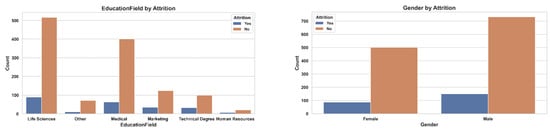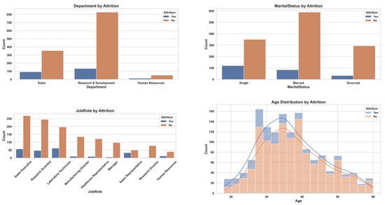 This study uses a synthetic employee dataset created by IBM data scientists [12] to emulate real-world HR data and uncover the drivers of Attrition. The dataset comprises 1470 records and 35 variables spanning demographics (age, gender, marital status, education level, and field), job attributes (job title, department, business travel frequency, monthly income, job level, years at company, and distance from home), and performance and satisfaction measures (Performance Rating, Job Involvement, Job Satisfaction, Environment Satisfaction, Work Life Balance and Relationship Satisfaction). The target variable, Attrition (Yes/No), indicates whether an employee left the organization. Several categorical predictors employ ordinal coding. Education is scored 1 (Below College) through 5 (Doctor); Environment Satisfaction, Job Involvement, Job Satisfaction and Relationshi Satisfaction range from 1 (Low) to 4 (Very High); Performance Rating spans 1 (Low) to 4 (Outstanding); and Work Life Balance from 1 (Bad) to 4 (Best) facilitating quantitative analysis of satisfaction, involvement and performance dimensions. This structure renders the dataset highly suitable for both classification tasks and exploratory data analysis. To reveal patterns underlying attrition, we conducted a visual examination (Figure 1), finding that younger employees, those in sales roles, single individuals, and employees with Life Sciences or Medical backgrounds exhibited higher attrition rates. These preliminary insights guided our feature selection strategy and informed subsequent modeling decisions, emphasizing the importance of both personal and role-specific variables in predicting turnover.
