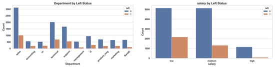 The second dataset employed in this study is the HR Analytics dataset published on Kaggle, which comprises anonymized HR records from a single company [13]. Consisting of 14,999 employee entries, it features the binary target variable left (0 = Stayed, 1 = Left) alongside a range of predictors including satisfaction level, last evaluation, number project, average monthly hours, time spend company, promotion last 5years, and salary (low, medium, high), as well as department. Examination of the class distribution reveals that approximately 24% of employees have left, creating a pronounced imbalance that can hinder the accurate prediction of the minority class; accordingly, resampling techniques such as SMOTE were applied to restore balance. Visual analyses (Figure 2) demonstrate that attrition rates are notably higher among sales staff and markedly lower in IT and technical departments, that employees in the low salary bracket are more likely to leave, and that those reporting low job satisfaction exhibit a pronounced increase in turnover. These observations underscore the critical influence of satisfaction and compensation factors on employee attrition.