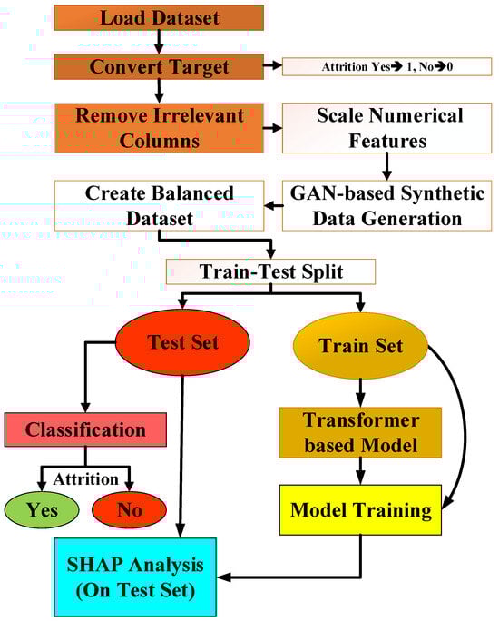 The proposed methodological pipeline is depicted in Figure 3. As illustrated, the process begins with loading the dataset and converting the target variable into a binary format, with attrition coded as 1 and non-attrition as 0. Numerical features are then scaled, and irrelevant variables are removed to ensure consistency and enhance model performance. To mitigate class imbalance, a balanced dataset is generated via GAN-based synthetic sampling. The refined dataset is subsequently split into training and test subsets. Leveraging the transformer encoder’s ability to capture complex feature interactions, a deep learning model is trained on the training partition, while classification is performed on the test partition. Finally, interpretability is enhanced through SHAP analysis, which quantifies feature contributions for each prediction. As detailed in Figure 3, this structured, modular framework not only optimizes predictive accuracy but also supports transparent, interpretable decision-making in HR analytics.