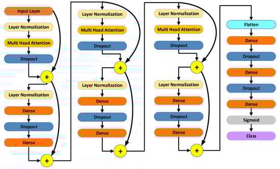The proposed classification model is built on a Transformer encoder architecture. It consists of three encoder blocks, each incorporating multi-head attention, layer normalization, and residual connections. At the end of each block, a feed-forward sublayer projects the attention output back to the original input dimension. Following the encoder stack, the network applies a flattening layer, two fully connected layers with 256 and 64 units respectively, and a dropout layer before a final single-neuron classifier with a sigmoid activation function. The overall architecture is depicted in Figure 4, with detailed layer parameter summaries presented in Table 2. By leveraging the encoder’s capacity to learn long-range dependencies in sequential inputs, this model is designed to deliver high accuracy on binary classification tasks. The Transformer encoder was implemented with four attention heads (head size 64), a feedforward dimension of 128, layer normalization (epsilon = 1 × 10−6), and residual connections in each block. Dropout rates of 0.1 within the encoder and 0.4 and 0.3 in subsequent dense layers were applied to mitigate overfitting. Positional encoding was not employed, as the data is tabular and lacks sequential dependencies. The model was trained with the Adam optimizer (learning rate 0.0001) using binary cross-entropy loss over 50 epochs, with validation monitoring to observe generalization performance.