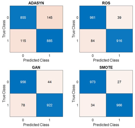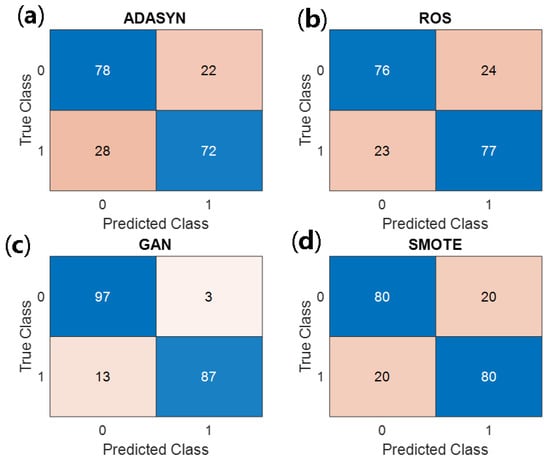 The confusion matrices for the ROS, GAN, and SMOTE oversampling methods are presented in Figure 5. The GAN-based approach achieves the fewest misclassifications, with only three false positives and thirteen false negatives, whereas ROS yields twenty-four false positives and twenty-three false negatives, and SMOTE produces twenty false positives and twenty false negatives. This comparison underscores the superior discrimination capability afforded by GAN oversampling.