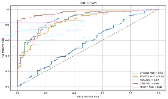 Figure 6 illustrates the ROC curves for each oversampling method. The GAN-derived curve remains closest to the ideal top left corner, corroborating its highest AUC of 96.32%, whereas ROS and SMOTE both approximate 87%, and ADASYN attains 84.24%.
