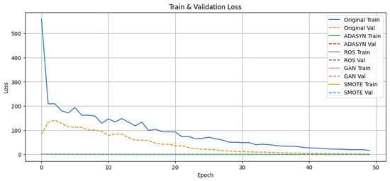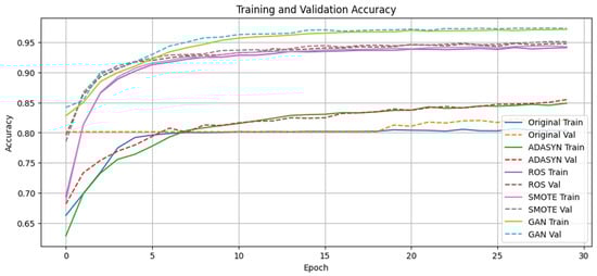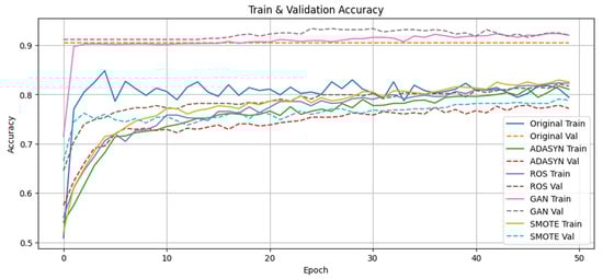 The epoch-wise evolution of training and validation loss is depicted in Figure 7, and the corresponding accuracy trajectories in Figure 8. Under GAN oversampling, loss declines precipitously below 50 within the first ten epochs and then plateaus, while validation accuracy surpasses 90%. In contrast, the other methods exhibit slower convergence and stabilize between 80% and 85% validation accuracy.