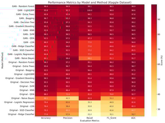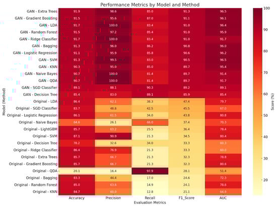 The classifier-by-method heatmap in Figure 9 provides a comprehensive overview of five evaluation metrics—accuracy, precision, recall, F1 score, and AUC—for a suite of fifteen classifiers applied to each oversampled dataset. GAN-generated data consistently yields the highest AUC values, with algorithms such as Extra Trees, Gradient Boosting, and LDA achieving over 95%. Conversely, classifiers trained on the original imbalanced data predominantly remain within the 60–85% AUC interval.