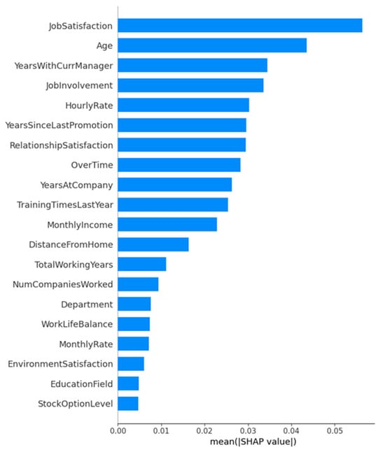 As depicted in Figure 10, JobSatisfaction stands out as the single most influential determinant of the retention prediction, followed by age and years with curr manager, which together underscore the centrality of employee contentment and tenure-related factors. Mid-ranking features such as job ınvolvement, hourly rate, and years since last promotion further highlight how both subjective engagement and objective career progression metrics modulate churn risk. In contrast, demographic and structural variables, for example, department, education field, and stock option level exhibit comparatively minor average impacts. This hierarchy of importance not only elucidates the drivers of model decisions but also aligns with theoretical expectations that satisfaction and managerial continuity are pivotal in curbing voluntary attrition.