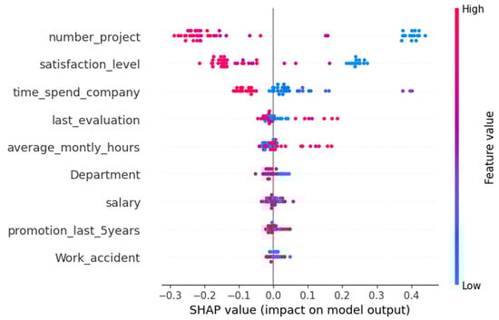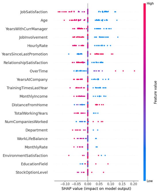 As shown in Figure 10, global SHAP analysis identifies job satisfaction, age, and years with currmanager as the three most influential predictors in the GAN-oversampled IBM HR model, together accounting for the largest mean absolute contributions to retention forecasts. Figure 11 complements this overview by depicting the distribution and directionality of individual SHAP values: higher job satisfaction scores (red points) consistently drive negative contributions to the attrition risk (i.e., favoring retention), whereas lower scores (blue points) shift the prediction toward separation. Analogously, older employees and those with longer service under the same manager exhibit predominantly retention-oriented impacts, while younger or more recently reassigned individuals tend toward positive SHAP values (increased attrition propensity). Features such as over time and years since last promotion display more heterogeneous effects, indicating that their influence varies across employee subgroups. Together, Figure 10 and Figure 11 provide both a global hierarchy of feature importance and a nuanced, instance-level understanding of how specific employee attributes modulate churn risk.