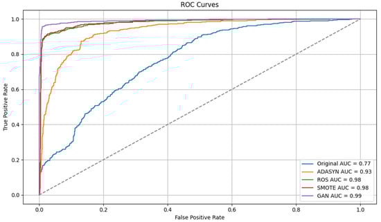 Receiver Operating Characteristic curves in Figure 13 further illustrate the superior discrimination of the GAN-augmented model (AUC = 0.99) relative to SMOTE and ROS (both AUC = 0.98), ADASYN (AUC = 0.93), and the imbalanced baseline (AUC = 0.77).