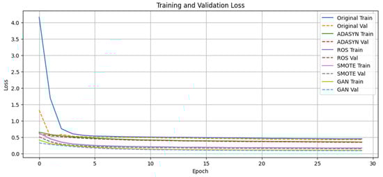 Epoch-wise training and validation accuracy (see Figure 14) reveal that GAN oversampling achieves over 95% validation accuracy within five epochs and maintains stability thereafter. Corresponding loss trajectories in Figure 15 show that GAN reduces validation loss below 0.4 rapidly, indicating both fast convergence and strong generalization; the other methods converge more gradually and to higher loss values.