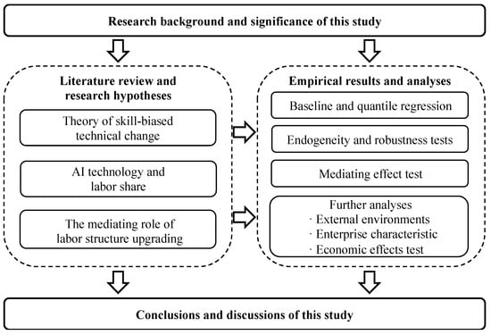 AI technology refers to technologies that simulate human cognitive functions through computer systems, with the goal of enabling capabilities such as learning, reasoning, perception, and decision making [7]. Existing studies have primarily examined AI technology’s economic consequences, including its effects on innovation output [8,9], productivity and employment [10], firm performance [11], and employee responsibility [12], yet largely overlooked its impact on firms’ labor share. In contrast to labor investment efficiency and labor productivity, labor share refers to the proportion of income that laborers receive in the enterprise [13]. A higher labor share can help enterprises to improve employees’ well-being and work efficiency [14]. Existing research has predominantly identified structural constraints, such as product market regulation, government investment, industry concentration, and the relative price of investment [15,16,17], as well as strategic enablers like digital transformation [13,18], as key determinants of labor share. However, the relationship between AI technology and labor share remains underexplored. Consequently, understanding how AI technology influences labor share and identifying the pathways through which this effect occurs have emerged as critically important research questions.