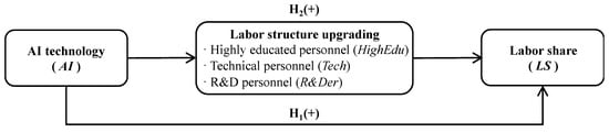 AI technology, as a disruptive digital technology, has the potential to transform organizational structures [34]. It not only enhances the productivity of high-skill workers who possess expertise in utilizing digital technologies but also displaces routine tasks through automation [22]. AI technology exhibits typical characteristics of skill-biased technical change, significantly influencing intra-firm labor allocation dynamics [6,35]. Therefore, this study explores the impact of AI technology on enterprise-level labor share through labor structure upgrading. Crucially, whereas conventional digital tools primarily substitute routine physical labor statically [31], AI-driven cognitive systems dynamically replace both routine physical and intellectual labor (e.g., financial and sales personnel) via intelligent decision-making assistance, while simultaneously enhancing the productivity of high-skill workers (e.g., research and development [R&D] personnel, and technical personnel) [36,37]. However, existing studies fail to recognize that labor structure upgrading serves as the critical transmission channel that reconciles AI’s displacement effects with its potential to enhance aggregate labor share. Based on the theory of skill-biased technical change, our framework advances the literature by demonstrating how AI technology reshapes labor share through active structural upgrading rather than passive skill-biased automation.
