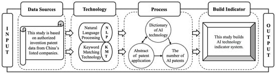 Our independent variable is artificial intelligence technology (AI). While prior literature predominantly employs questionnaires to evaluate the innovation and adoption of AI technology in enterprises [32,57], such self-reported data exhibit inherent limitations in sample coverage and scalability, particularly for constructing large-scale panel datasets. To address this methodological gap, this study generates a “Dictionary of AI technology” (see Figure A1) adapted from Xi & Shao [9]. Based on natural language processing (NLP) and keyword-matching technologies, this study searches for AI technology terms in patent abstracts to determine whether a patent is AI related [58]. Specifically, if terms such as Machine Learning, Intelligent Computing, Big Data Analytics, and Neural Network from the “Dictionary of AI technology” are identified in the abstract of the granted patent, this study classifies the patent as an AI patent. Finally, the natural logarithm of the number of AI patents is used as a metric for measuring the level of AI technology. The screening flowchart for indicator of AI technology is presented in Figure 3.
