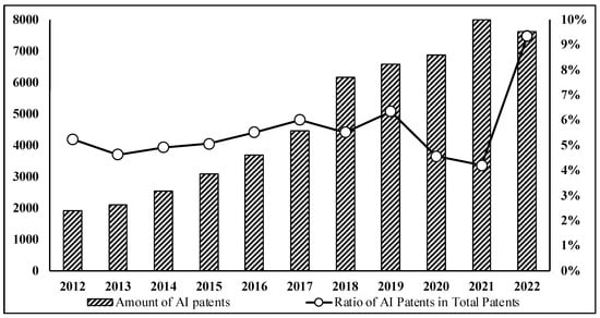 Empirical validation of this measurement framework reveals critical insights. As illustrated in Figure 4, the number of AI patents among China’s listed companies exhibited sustained growth from 2012 to 2021. Although the number of AI patents decreased in 2022, the proportion of AI patents to total patents peaked at 9% in that year. This divergence illustrates that AI patent development demonstrates stronger resilience compared to non-AI patents amid macroeconomic turbulence, suggesting that our methodology successfully captures strategic prioritization of AI technology, a dimension obscured by traditional survey-based measures.