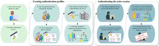 - Metaverse office. The Metaverse office is a virtual workspace that facilitates remote work by enabling employees to collaborate or perform business tasks free from space and time constraints. The Metaverse office involves many business and confidential documents; thus, if the ML classifier detects a potential unauthenticated user during an active session, the office restricts access to the user temporarily and prompts additional authentication. As the central component of the proposed framework, the Metaverse office serves as the environment where all other components function to enable continuous user authentication.