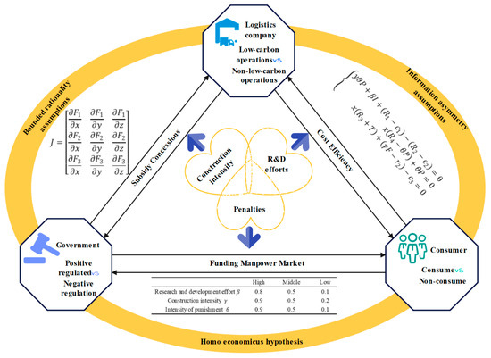 Specifically, in promoting green logistics, logistics enterprises are guided and regulated by government policy formulation and driven by consumers’ growing demand for green consumption. As a policymaker and regulator, the government’s policy orientation and incentive measures significantly impact the green transformation of logistics enterprises. The feedback of consumers and logistics enterprises also restricts them. As the ultimate driving force of the market, consumers’ green consumption habits not only affect the market positioning of logistics enterprises but also urge the government to improve relevant policies further to promote the development of green and low-carbon consumption. On the one hand, transportation, storage, packaging, and other logistics industry links involve much energy consumption and carbon emissions. Regarding transportation, vehicles such as trucks, ships, and aircraft will produce many greenhouse gas emissions. In warehousing and packaging, improper storage methods and excessive packaging will also lead to resource waste and environmental pollution [9]. Therefore, realizing the low-carbon transformation of the logistics industry and reducing energy consumption and carbon emissions is of great significance for alleviating environmental pressure and promoting sustainable economic and social development. On the other hand, with the improvement of consumers’ awareness of environmental protection and the guidance of policies, green and low-carbon consumption has gradually become a new consumption pattern [10]. This consumption pattern emphasizes reducing the negative environmental impact in the consumption process, promoting the recycling of resources and low-carbon development. Consumers are increasingly inclined to choose environmentally friendly and energy-saving products and services, which puts forward higher requirements for the low-carbon development of the logistics industry [11]. Therefore, this paper will deeply analyze the strategic interaction and mutual influence of logistics enterprises, the government, and consumers in the green and low-carbon transformation. Constructing an evolutionary game model reveals the interdependence between the three.