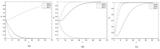 When and are both at a low intensity, the consumer evolution paths under different conditions of are shown in Figure 16a. Consumers will choose to spend only when the government imposes a high level of punishment. However, when the penalty is moderate or low, consumers may initially be inclined to choose to consume, but eventually, they will still abandon this option.