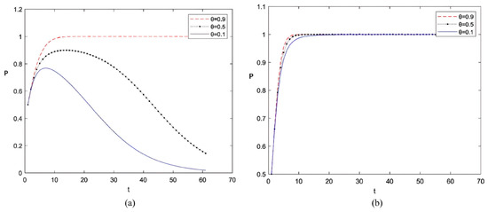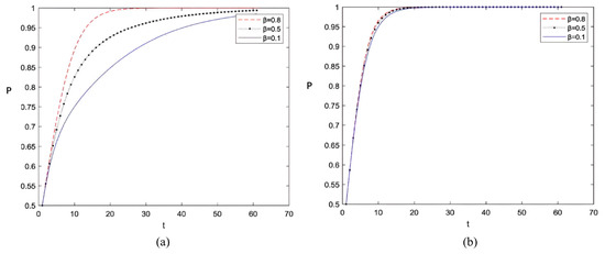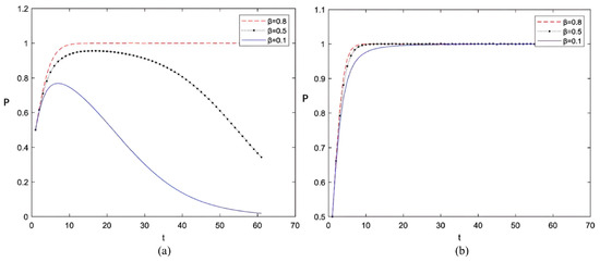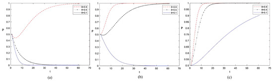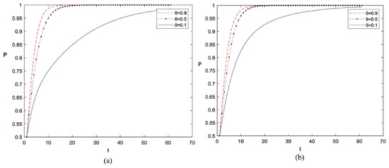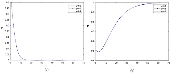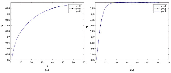In contrast, when and are both taken as the medium force, the consumer evolution path under different values of is shown in Figure 16b. Because the government provides strong guarantees in technology research and development and infrastructure construction, consumers will ultimately choose to consume regardless of the severity of the penalties imposed by the government. It can be seen that different punishment intensity has no significant impact on the time required for consumers to make a choice.