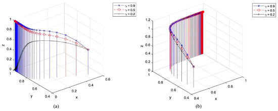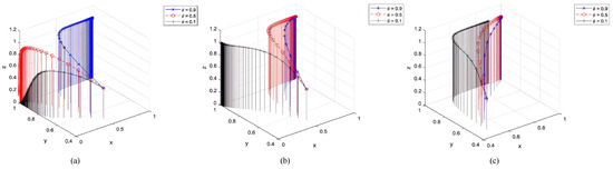 When and are both at low-intensity levels, as shown in Figure 9a, Figure 10a, Figure 11a and Figure 12a, the evolutionary game path diagram of under three different R&D intensity levels: high intensity (0.9), medium intensity (0.5) and low intensity (0.2) are studied in depth. Further, as shown in Figure 9b, Figure 10b, Figure 11b and Figure 12b, when and are biased to the medium level of strength, the evolutionary game path diagram is drawn correspondingly under three different R&D strengths: high, medium, and low. It is worth noting that when and both reach high dynamics, their evolutionary paths are similar to those at medium dynamics.