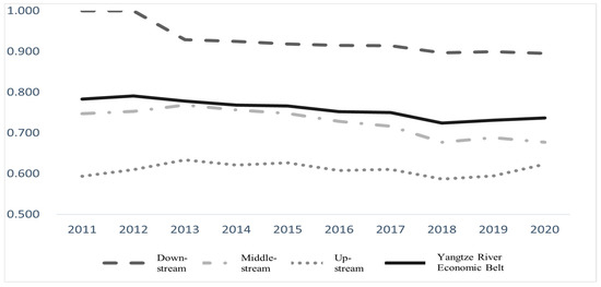 The tendency graph of energy efficiency in the Yangtze River Economic Belt during the research period of 2011–2020.
