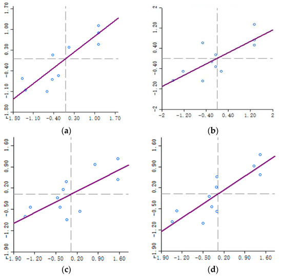 Similar to the global Moran’s I, the Z-test can also be used to determine whether there are obvious characteristics of local spatial correlation. The definition of Zi is shown in Formula (5), where E(Ii) and Var(Ii) are the expectation and variance of the local Moran’s I, respectively. The local Moran’s I can be visually expressed through the Moran scatter plot and the LISA cluster map. In this study, the Moran scatter plot is mainly used to study the local spatial correlation of the Yangtze River Economic Belt.