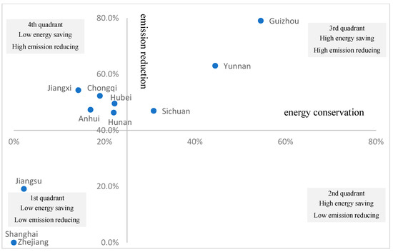 The improvement potential of 11 provinces in the Yangtze River Economic Belt is analyzed from the two aspects of energy conservation and emission reduction. These regions are classified into four different regional combinations according to the average value of energy conservation potential and emission reduction potential, as a two-dimensional matrix as depicted in Figure 3. Each combination represents different energy conservation and emission reduction performances. Combined with the current status of energy conservation and emission reduction potential in the Yangtze River Economic Belt, we define regions with an energy conservation potential average value of less than 25% as those with high energy utilization efficiency, and regions with a comprehensive emission reduction potential average value of less than 40% for the two environmental constraints (carbon dioxide and sulfur dioxide) as low emission reduction regions.