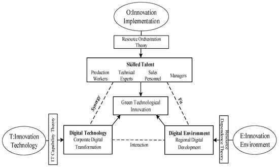 The TOE framework not only provides theoretical support for selecting the causal variables in this study but also offers a valuable perspective for analyzing configurational multiplicity. According to this framework, organizational, technological, and environmental conditions collectively influence green technological innovation, with multiple configurations representing different combinations of these three factors. In addition to configurational multiplicity, theoretical multiplicity necessitates the use of multiple, competing, or complementary theories to fully explain the reasons behind the emergence of a specific configuration [21]. Given the multiplicity of configurations and theories, this study integrates resource orchestration, resource dependence, and IT capabilities theories to construct a TOE analysis framework that examines the impact of different types of skilled talent on green technological innovation under the context of dual digitalization, as illustrated in Figure 1.