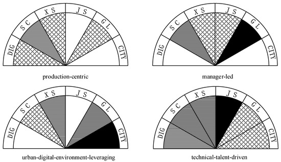 To intuitively compare the differentiated talent arrangement models of “different paths leading to the same goal,” the configurations outlined above are briefly illustrated in Figure 2. None of the four configurations require all types of skilled talent to be core conditions; instead, the presence of any specific type of talent is sufficient. This suggests that organizations can enhance green innovation by leveraging key talent breakthroughs and collaborative efforts from other employees, based on the digital resources available to the company and the region. Specifically, (1) the Production Worker Type indicates that when digitalization within the enterprise cannot drive innovation, production personnel play a key role in achieving high green technological innovation, representing a one-size-fits-all development model. This suggests that a talent advantage in a specific area is a significant driver of green technological innovation and highlights the importance of investing in and cultivating core skill talent in specialized firms. (2) The Managerial Type suggests that when both the enterprise and the region’s digitalization have minimal impact on green innovation, innovation can still be driven through the leadership of managers guiding production workers. (3) The Urban Environment Type suggests that when the enterprise’s digitalization capability is weak, but the city’s digital economy is developing rapidly, regional digital platforms should be fully utilized to promote green technological innovation, with an emphasis on the positive role of management and sales talent in leveraging the benefits of the digital economy. (4) The Technical Talent Type indicates that when the city’s digitalization is low, but the enterprise’s digital projects are operating well, the focus should be on developing the green innovation capacity of technical personnel, guiding production and sales personnel to cooperate actively. In conclusion, companies should strategically arrange various skilled talents based on their own and the region’s digitalization levels to drive green technological innovation.