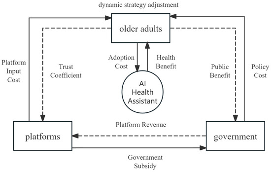With the acceleration of global population aging and the rapid development of digital health technologies, AI health assistants have demonstrated significant potential in the domain of smart elderly care. However, their adoption among older adults remains constrained by multiple factors, including insufficient trust, fluctuating platform service quality, and inadequate policy incentives. To uncover the behavioral interactions and dynamic co-evolution mechanisms among older adults, platforms, and governments during the adoption process of AI health assistants, this study constructs a tripartite evolutionary game model based on Evolutionary Game Theory (EGT). The model aims to analyze the coupling mechanism between trust formation, platform investment willingness, and the strength of government incentives. The conceptual diagram of the three-party game is shown in Figure 1.