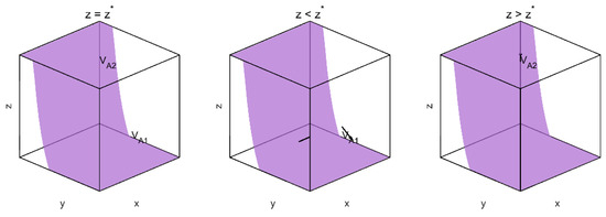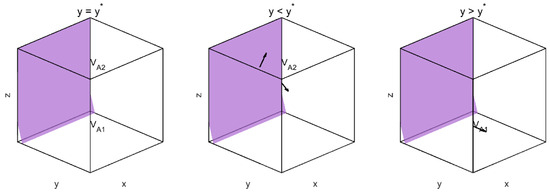 Figure 2 illustrate the evolutionary dynamics under different conditions of the variable , with the purple surfaces representing subsets of the state space. Arrows indicate the trajectory direction within each plane: when , the system exhibits transitional stability; when , trajectories converge downward, suggesting decay into a low-cooperation state; and when , trajectories flow upward toward , indicating a shift toward stable cooperation. These diagrams highlight the bifurcation effect around the critical threshold .