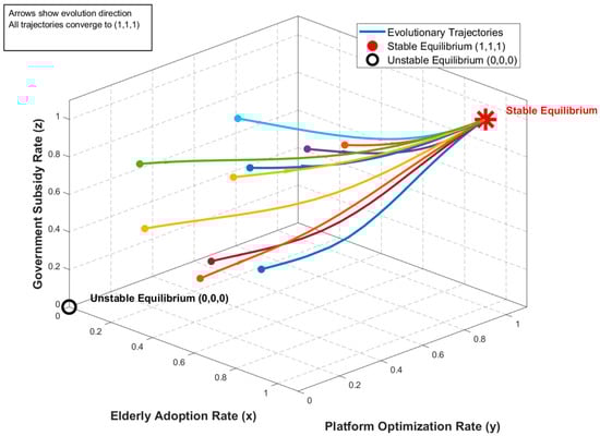 Figure 7b compares the evolutionary trajectories of system variables under two trust levels—low trust ( = 0.5) and high trust ( = 0.95). The same initial condition (0.5, 0.5, 0.5) is used, with solid lines representing high-trust scenarios and dashed lines for low-trust cases. Trajectories are marked with triangles, circles, and squares (5–6 markers per curve). The simulation indicates that under high trust, user adoption, platform optimization, and government subsidy rates grow more quickly and converge toward a positive equilibrium. These findings underscore the importance of trust mechanisms in shaping favorable system dynamics and should inform future policy design.