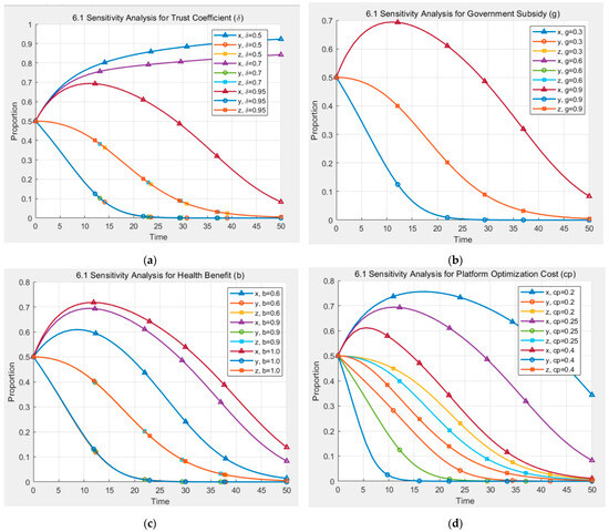 Dynamic analysis of sensitivity graphs: (a) Sensitivity analysis for trust coefficient; (b) Sensitivity analysis for government subsidy; (c) Sensitivity analysis for health benefit; (d) Sensitivity analysis for platform optimization cost.