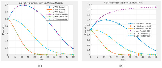 Policy simulation and scenario comparison (a) Comparison of Subsidy vs. No-Subsidy Policies; (b) Comparison of Low vs. High Trust Environments.