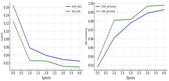 The CNN model (Figure 11 and Figure 12) demonstrated a consistent decrease in loss and increase in accuracy over time. However, it plateaued slightly below the performance of the proposed CNN–BiLSTM model, highlighting its inability to capture sequential dependencies critical to Android malware behavior, as also noted in prior studies [14,15].
