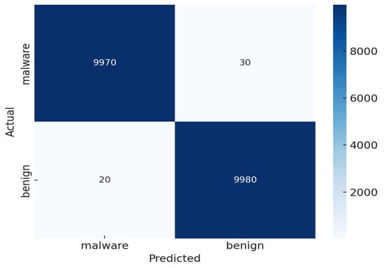 These quantitative comparisons clearly establish that our CNN–BiLSTM model—enhanced with Mutual Information for feature selection and Bayesian Optimization for hyperparameter tuning—delivers superior classification performance [52,53,54]. The cascading architecture effectively captures both spatial and temporal malware behavior, while the optimization steps ensure efficient and robust training. This confirms the architectural and methodological decisions that underpin the model’s exceptional ability to detect Android malware with minimal error and high generalization.