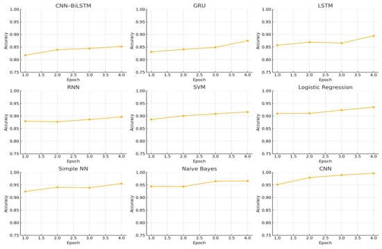 Similarly, the LSTM model (Figure 11 and Figure 12) exhibited a steep learning curve during the initial epochs, benefiting from its ability to model temporal sequences [44,45]. Yet, its accuracy ultimately stabilized below the CNN–BiLSTM model, indicating the added value of incorporating spatial features through CNN layers—an insight supported by recent hybrid deep learning research in cybersecurity [46,47].