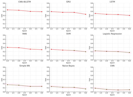 SVM (Figure 11 and Figure 12), although initially competitive, exhibited stagnation in accuracy improvement and higher loss values compared to deep learning models. Its performance limitations stem from its inability to handle large feature spaces and nonlinearity [48,49], particularly in contexts requiring layered, contextual interpretation of app behavior.